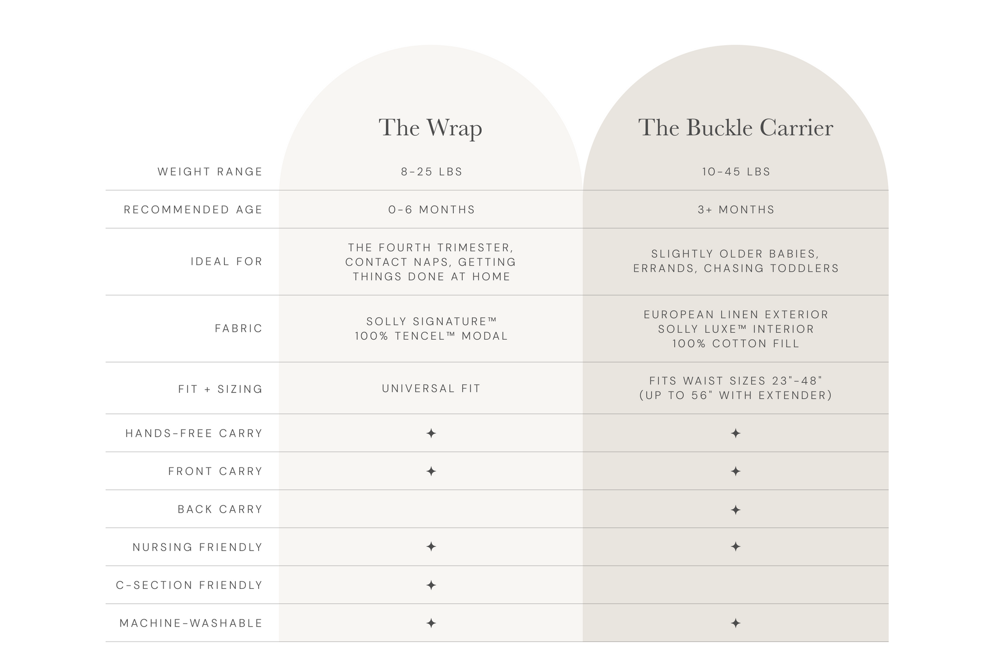 Most parents use The Wrap during the newborn and infant months (8–25 lbs). Around four to six months, as baby gets heavier and more active, you may find The Buckle Carrier more supportive. Many families switch between the two depending on the activity—choosing The Wrap for snuggly naps and The Soft Carrier for longer walks or outings.